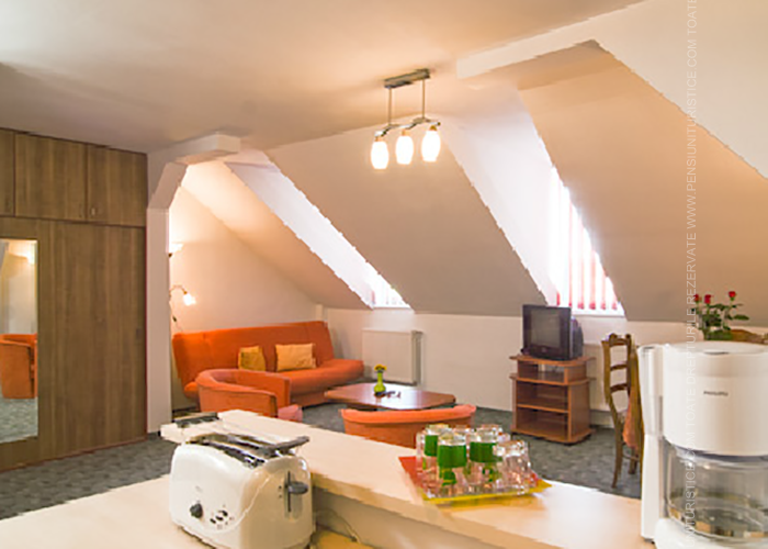 - Cazare in cinci studiouri, doua apartamente cu un dormitor si doua apartamente cu doua dormitoare, camera de familie