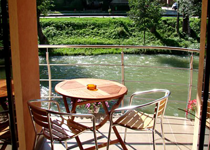 - Plaja cu sezlonguri pe terasa dinspre raul Cerna